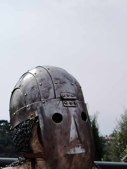 The war dress is based on the descriptions that the contemporary authors of Saladin left us and on the interpretations of the historian David Nicolle. A brocade caftan, a red reproduction of a Turkish caftan from the 12th century, is worn under a kazaghan, mesh armor covered with layers of fabric. The caftan was loaned to us by a member of the association who had it made by Living History Market. The kazaghan is a "light" model, short, that Saladin can easily carry in his daily life, as described in the texts. It is made of yellow puffy silk (historical sprain since we did not receive yellow taffeta silk in time…). It was made by a member of the association, entirely by hand: Rémy Campo. The dominant colors worn by Saladin are yellow, mainly, as described by William of Tyre, and red to a lesser extent. On his head, he wears a helmet covered with inscriptions and gold motifs, inspired by a Syrian helmet dating from the twelfth century. The texts speak of a golden helmet worn by Saladin. This helmet is completed with a mesh windshield, as the archaeological piece suggests. The helmet was made by a friend Dimitri Zaphirato, who is always motivated for the original realizations! Saladin wears an eastern belt dating from the 12th and 13th centuries, whose archaeological piece was found in Syria. It was made by L'An Mil. His sword is inspired by an older model, dated very roughly from the 10th or 11th century by David Nicolle. Anne Marie Eddé and David Nicolle agreed that Saladin carried a straight, carved sword. This sword therefore suits quite well the descriptions available: the inscriptions in Arabic on the guard take up a passage from the Koran exhorting Jihad, a text widely exploited by Saladin to unify the Muslims around him, against the Franks.